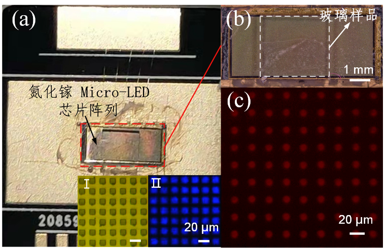 4a)基于玻璃內部納米晶發光單元的micro-LED器件照片,插圖IGaN micro-LED芯片陣列,插圖II:亮藍色發光mciro-LED芯片陣列;(b)圖(a)的放大圖;(d)玻璃內部在藍光激發下的紅色發光陣列照片