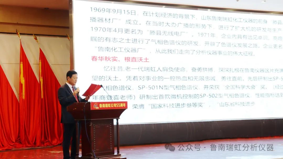 活動(dòng)由中國科學(xué)院空天信息創(chuàng)新研究院研究員馬天軍主持。伴隨著激昂的樂曲,公司董事長孔繁巖登臺(tái)致辭,他首先代表公司向現(xiàn)場的各級領(lǐng)導(dǎo)、各界人士,表示熱烈的歡迎和衷心的感謝!他指出山東魯南瑞虹化工儀器有限公司走過了五十五年風(fēng)雨歷程,在改革開放的巨浪中抓住機(jī)遇,以市場需求為導(dǎo)向,積極開拓新領(lǐng)域。特別是面對三年疫情,在經(jīng)濟(jì)環(huán)境相對惡劣的情況下,針對市場變化,優(yōu)化產(chǎn)品,物聯(lián)互通,智能運(yùn)用,贏得了市場,銷量屢創(chuàng)新高。魯南瑞虹以振興國產(chǎn)儀器為己任,以引領(lǐng)色譜技術(shù)創(chuàng)新,持續(xù)為客戶創(chuàng)造價(jià)值為使命。打造中國色譜儀器高端品牌!向百年目標(biāo)奮進(jìn)!