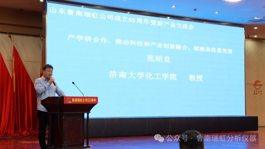 濟(jì)南大學(xué)化學(xué)化工學(xué)院副院長張昭良教授登臺(tái)致辭。張教授講到他和瑞虹結(jié)緣多年,合作了多個(gè)項(xiàng)目,使用過瑞虹公司多種型號色譜儀器,同時(shí)希望瑞虹公司在未來的道路中專注高端儀器的研發(fā)與制造,加強(qiáng)校企合作,為客戶提供更好的色譜產(chǎn)品和服務(wù)。