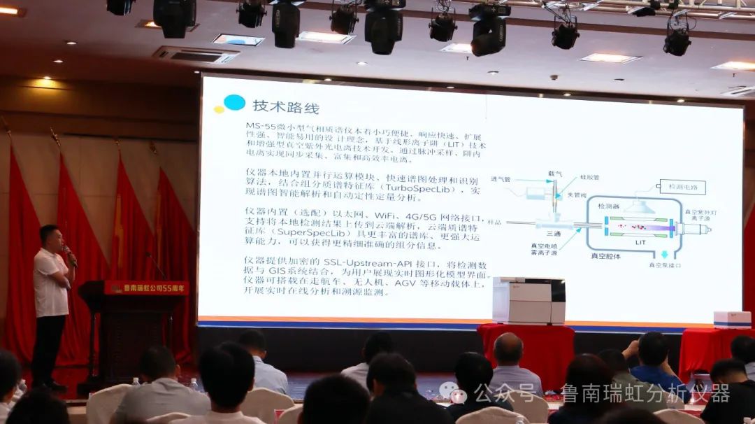 公司研發(fā)部負(fù)責(zé)人孔祥謙詳細(xì)的介紹了此次發(fā)布的GC-55型氣相色譜儀、MS-55型微小型質(zhì)譜儀。GC-55搭載10.1寸高清大屏,圖形顯示儀器運(yùn)行狀態(tài),擁有新一代進(jìn)樣口、新一代檢測器,快速升溫,極速降溫兼容更多檢測器。MS-55微小型氣相質(zhì)譜儀本著小巧便捷、響應(yīng)快速、擴(kuò)展性強(qiáng)、智能易用的設(shè)計(jì)理念,基于線形離子阱(LIT)技術(shù)和增強(qiáng)型真空紫外光電離技術(shù)開發(fā)。通過脈沖采樣、阱內(nèi)電離實(shí)現(xiàn)同步采集、富集和高效率電離。