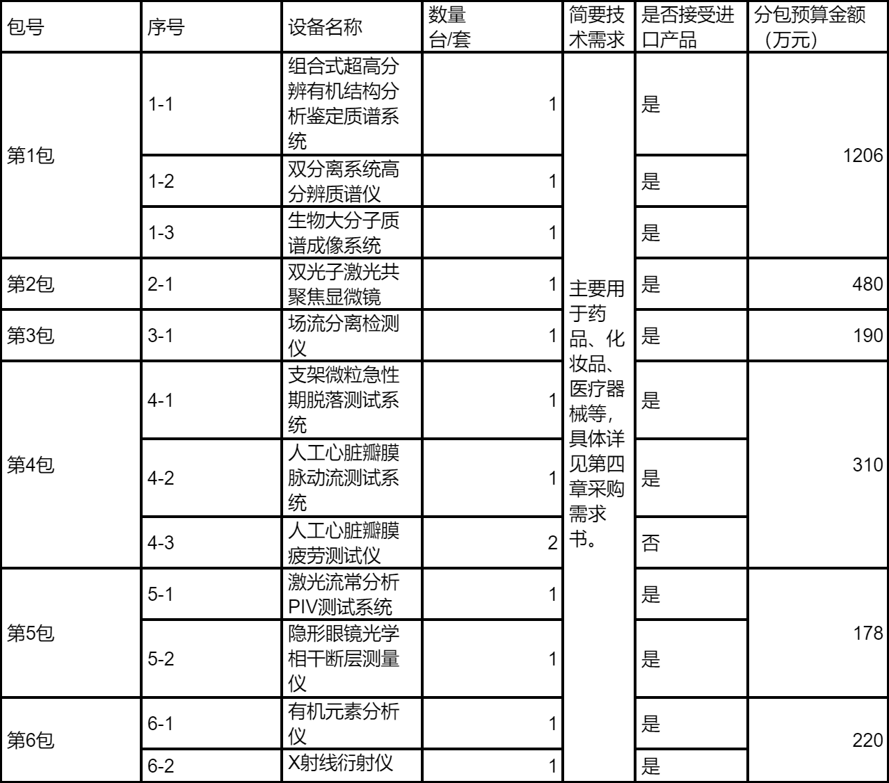 (1)包件11-1組合式超高分辨有機結構分析鑒定質譜系統:486萬元;1-2雙分離系統高分辨質譜儀:360萬元;1-3生物大分子質譜成像系統:360萬元。