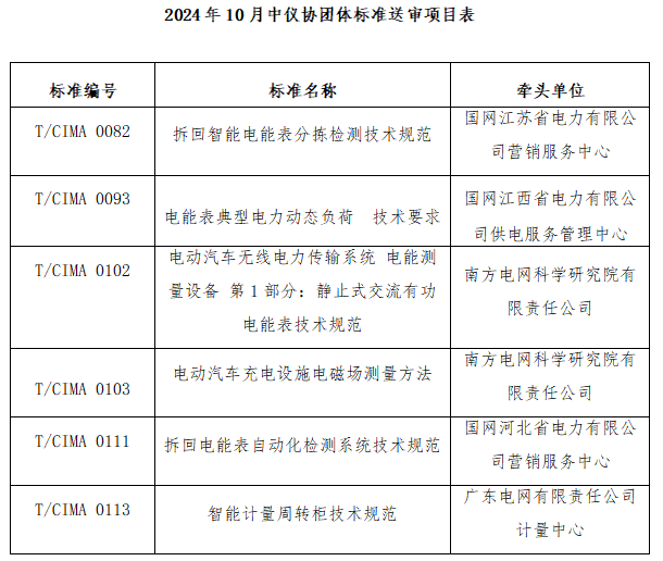 2024年10月 24-25日,中國儀器儀表行業協會(以下簡稱“協會”) 以視頻會議形式組織召開了《電能表典型電力動態負荷 技術要求》等6項團體標準(項目信息詳見附表)送審稿審查會。來自國網山東省電力公司電力科學研究院、廣東電網有限責任公司計量中心、中國電力科學研究院計量研究所、國網浙江省電力有限公司營銷服務中心、廣西電網計量中心、中國電力科學研究院有限公司、國網河南省電力公司營銷服務中心、國網山東省電力公司、黑龍江省電工儀器儀表工程技術研究中心有限公司的九位專家組成審查組,國網山東省電力公司電力科學研究院的徐民教授級高工擔任組長。會議由協會副秘書長程紅主持。協會及電工儀表分會的團體標準工作人員、標準主要起草人參加了本次會議。