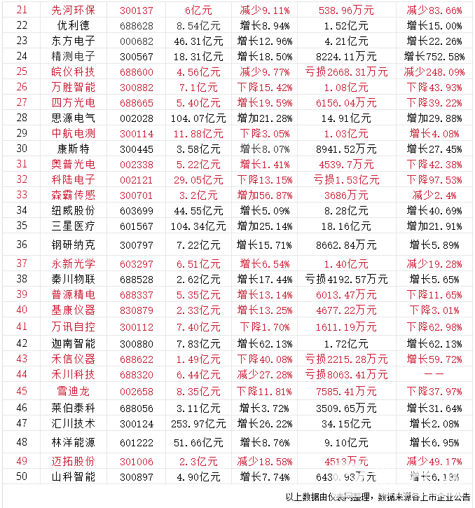 從虧損程度來看,50家企業(yè)中凈利潤出現(xiàn)虧損的有6家,分別為譜尼測試虧損2.34億元,同比減少322.2%;皖儀科技虧損2668.31萬元,同比減少248.09%;科陸電子虧損1.53億元,同比下降97.53%;秦川物聯(lián)虧損4192.57萬元,同比增長5.65%;禾信儀器虧損2215.28萬元,同比增長59.72%;禾川科技虧損8063.41萬元。