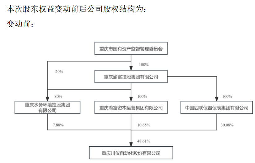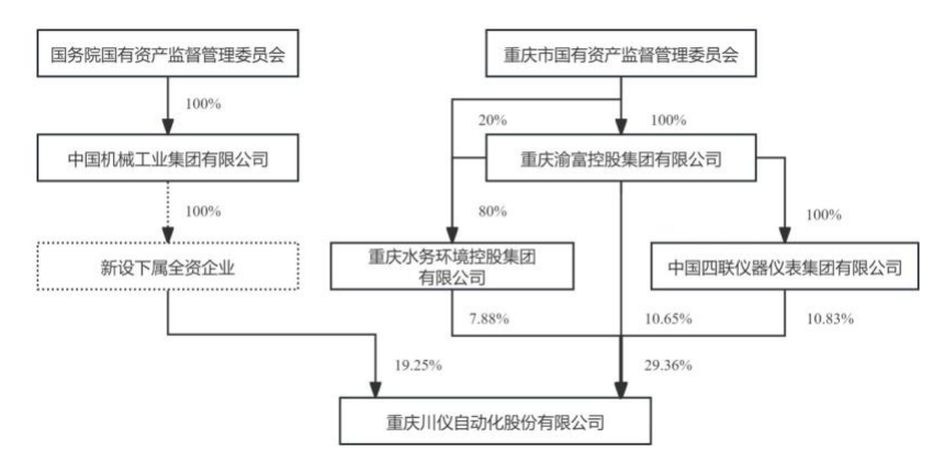 上述交易完成前,重慶市國(guó)資委合計(jì)掌控川儀股份48.61%的股份比例。上述交易完成后,重慶市國(guó)資委合計(jì)掌控川儀股份29.36%的股份比例,國(guó)機(jī)集團(tuán)或其新設(shè)全資企業(yè)將持有川儀股份19.25%的股份比例。