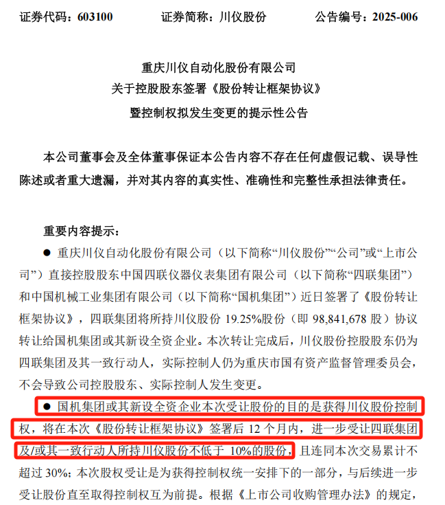 公告顯示,1月13日,四聯(lián)集團(tuán)與國(guó)機(jī)集團(tuán)簽署《股份轉(zhuǎn)讓框架協(xié)議》,約定由國(guó)機(jī)集團(tuán)或其新設(shè)全資企業(yè),協(xié)議受讓四聯(lián)集團(tuán)所持川儀股份9884.17萬(wàn)股股份,占川儀股份總股本的比例為19.25%。