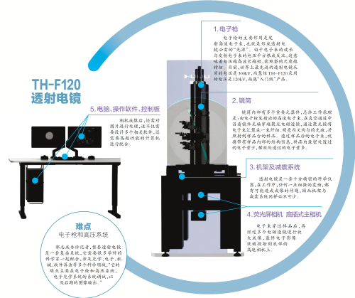 電子槍的主要作用是發射高速電子束,也就是形成透射電鏡必需的“光源”。由于電子束的波長與發射電子束的電壓平方根成反比,這意味著電壓越高波長越短,能觀察的尺度越精細。目前,世界上最先進的透射電鏡采用的電壓是300kV,而慧炬TH-F120采用的電壓是120kV,尚屬“入門級”產品。