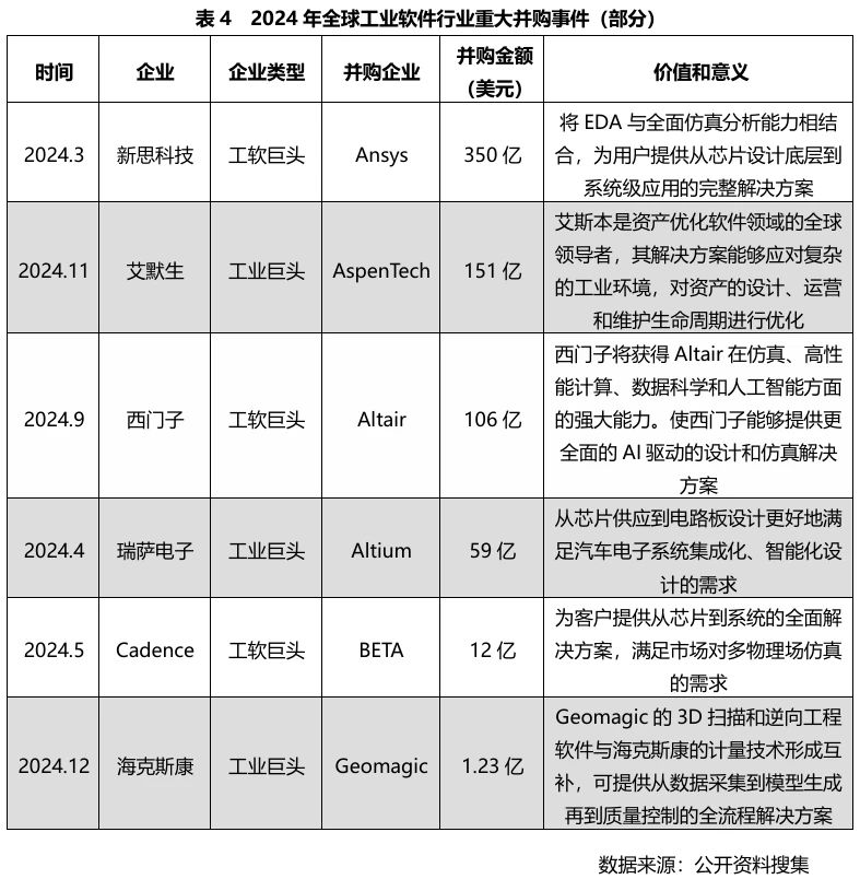 知名行業(yè)專家林雪萍和易賦指出:并購和整合是工業(yè)軟件巨頭近二十年來發(fā)展的主旋律,工業(yè)軟件巨頭的企業(yè)成長史就是一部并購史[5]。2024年全球工業(yè)軟件領(lǐng)域再掀并購巨浪,以新思科技史無前例的350億美元收購Ansys為最。國際工業(yè)軟件,進(jìn)入活火山一般的活躍交易期,而且往往都是以大型交易為主力戰(zhàn)場[6]。