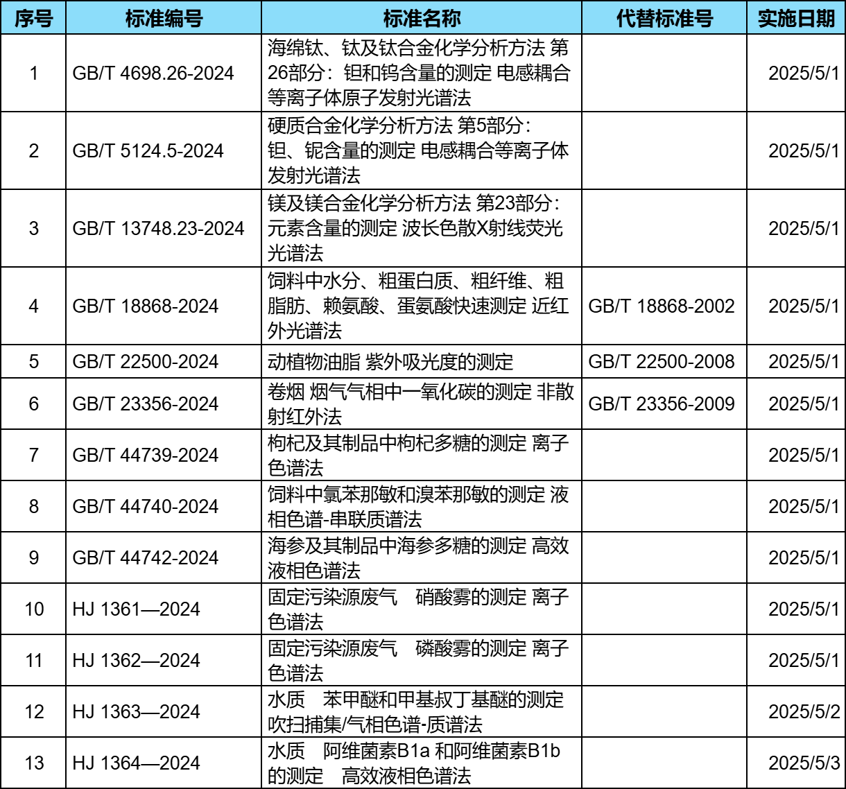 2025年5月1日,一批涉及色譜、質(zhì)譜、光譜等分析測試方法的國家標準正式實施。這些標準廣泛應(yīng)用于食品、化工、地質(zhì)、環(huán)境等個領(lǐng)域,旨在進一步規(guī)范分析測試技術(shù),提升行業(yè)檢測能力和科學(xué)性。