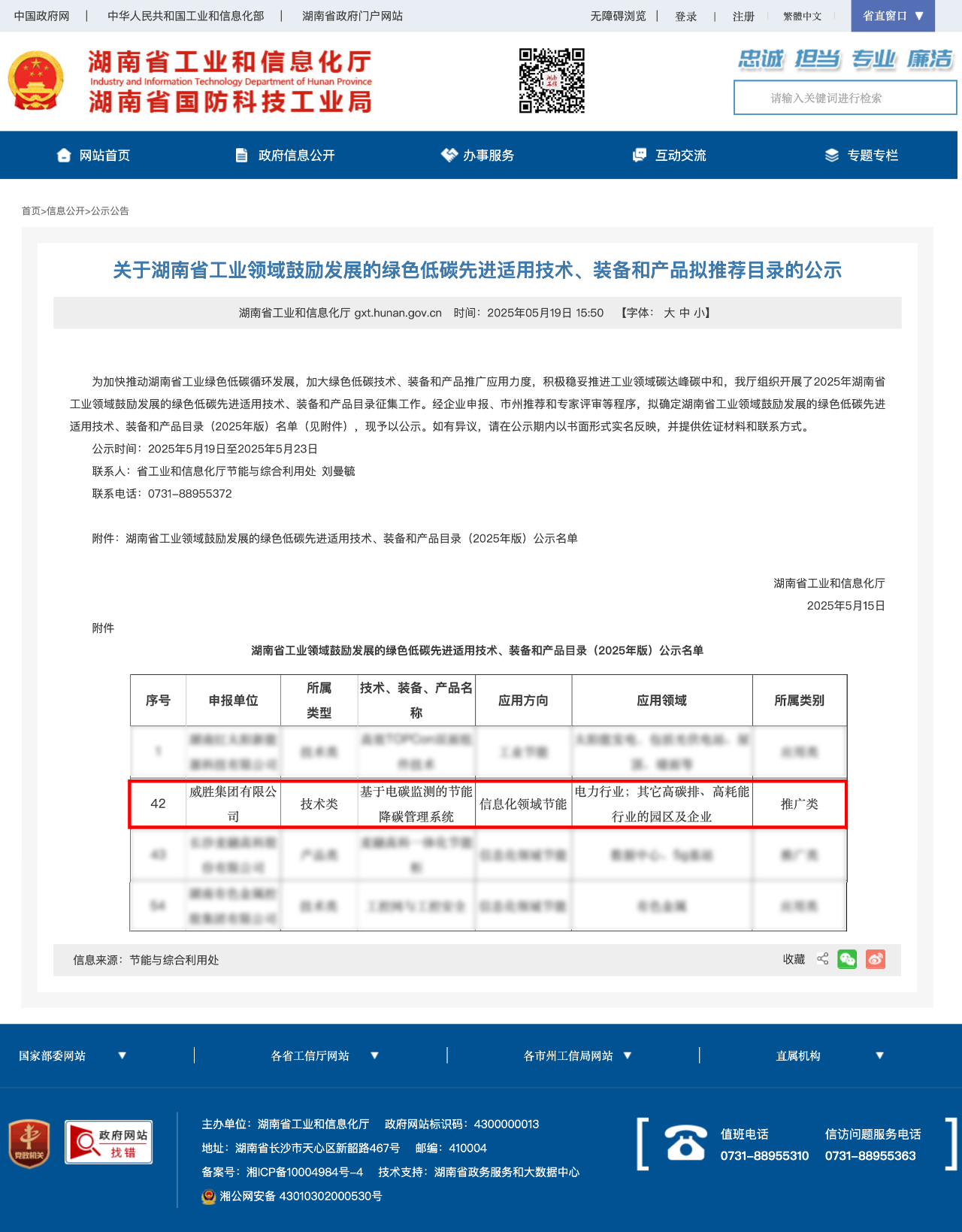 近日,由湖南省工業(yè)和信息化廳組織開展了湖南省工業(yè)領(lǐng)域鼓勵發(fā)展的綠色低碳先進(jìn)適用技術(shù)、裝備和產(chǎn)品推薦目錄征集工作。經(jīng)企業(yè)申報、市州推薦和專家評審等程序,威勝集團(tuán)基于電碳監(jiān)測的節(jié)能降碳管理系統(tǒng)榮登榜單。