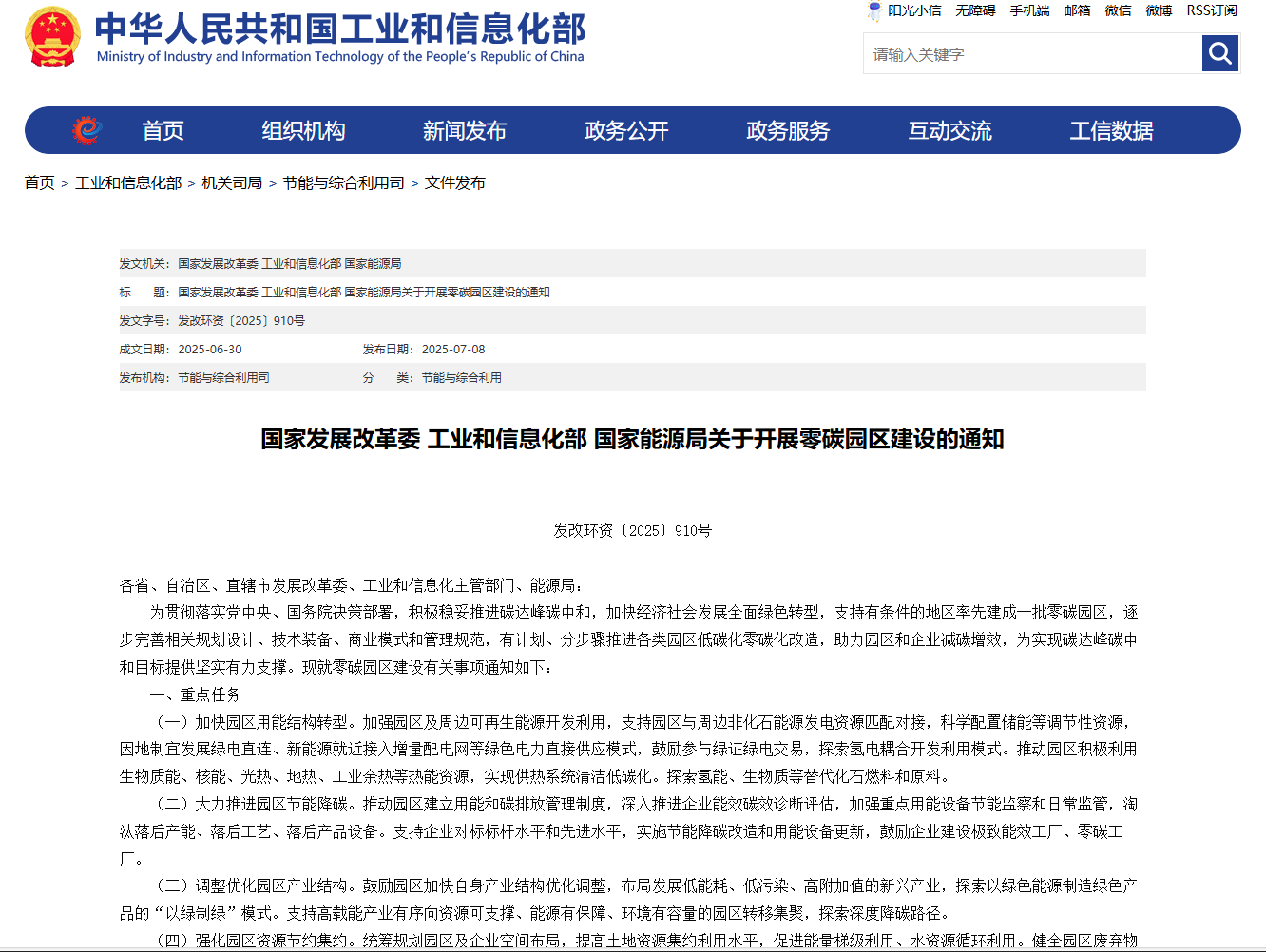 《開展零碳園區(qū)建設(shè)的通知》通知(部分截圖)