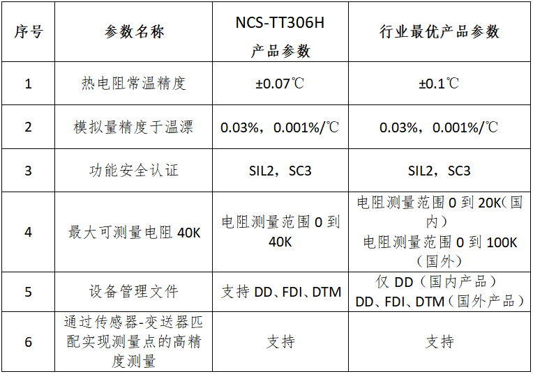 NCS-TT306H采用數(shù)字化技術(shù),內(nèi)置24bit高性能ADC,實現(xiàn)高可靠性、高測量精度和高長期穩(wěn)定性,滿足各種工業(yè)現(xiàn)場的測溫需求。真正雙通道設(shè)計,6端子的傳感器設(shè)計可滿足不同的雙輸入組合,可用于對冗余有要求的關(guān)鍵應(yīng)用場合。符合IEC 61508功能安全標(biāo)準(zhǔn)的全面評估,安全等級達(dá)到了SIL2、SC3的要求。