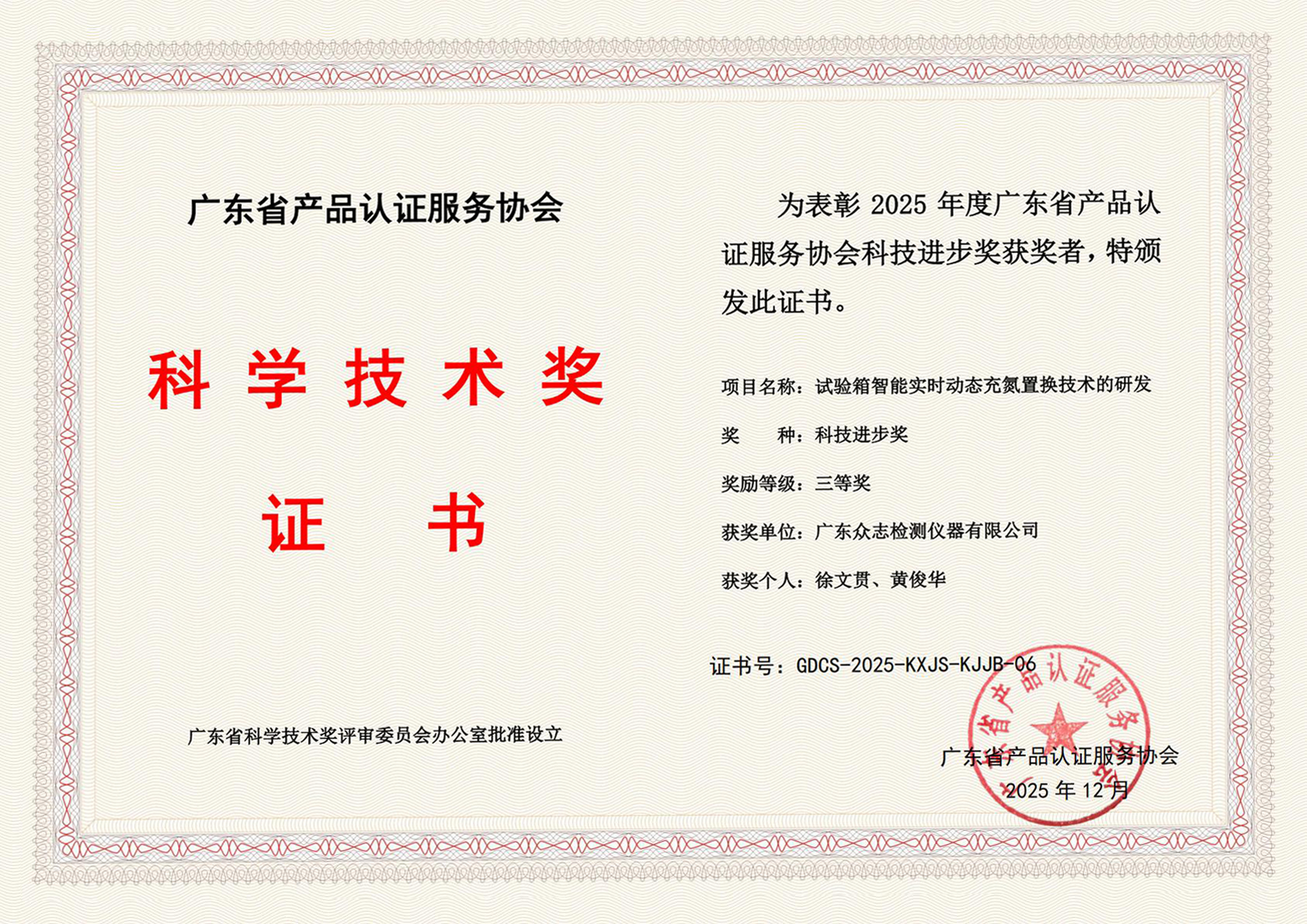 近日,廣東省產品認證服務協會正式公布了2025年度科學技術獎(科技進步獎)獲獎名單。廣東眾志檢測儀器有限公司憑借“試驗箱智能實時動態充氮置換技術的研發”項目,榮獲科技進步獎三等獎。這一榮譽不僅是對企業技術實力的認可,更是對其在半導體核心裝備國產化進程中突出貢獻的充分肯定。