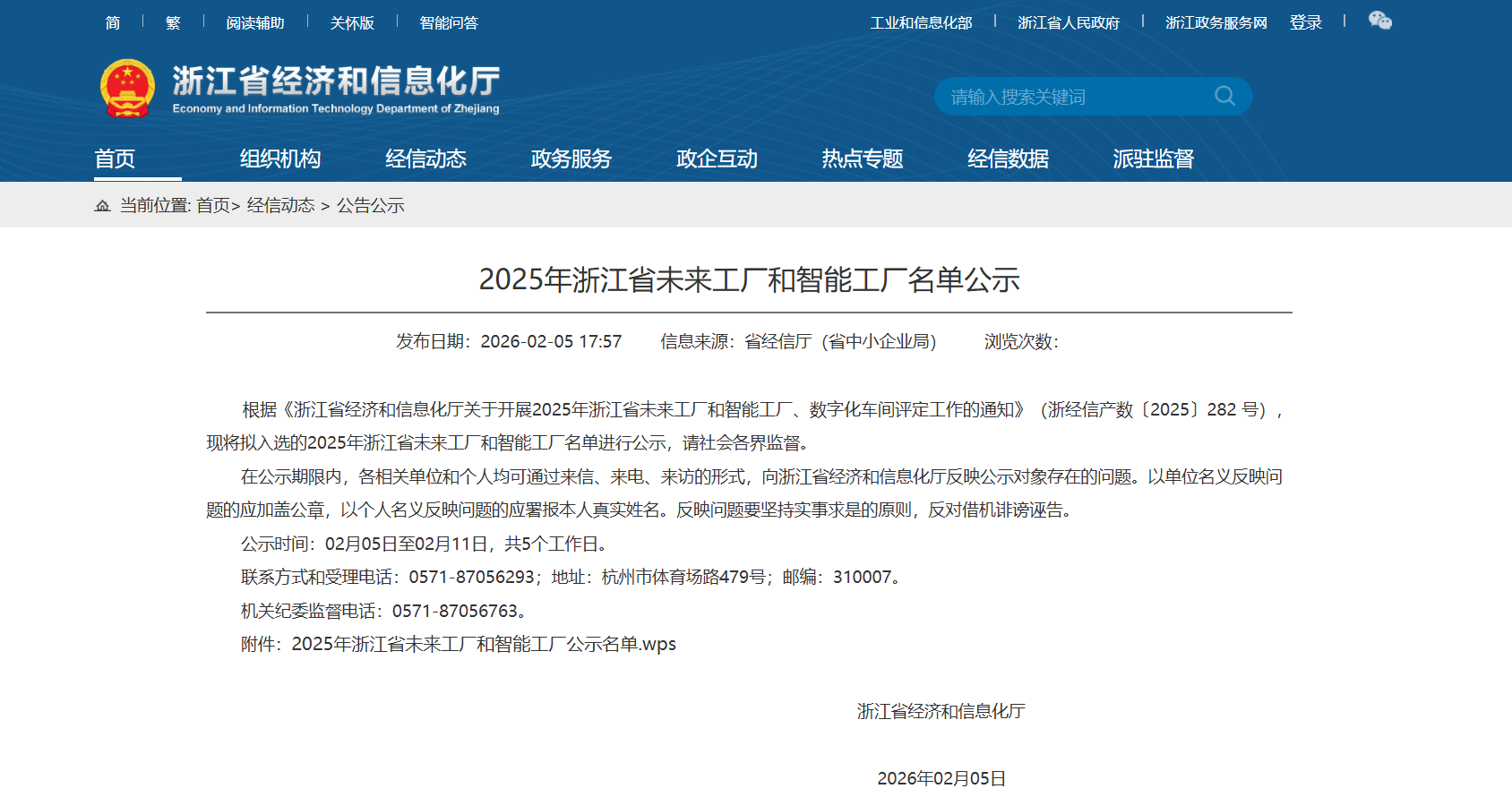 近日,浙江省經濟和信息化廳正式公示了2025年度浙江省智能工廠項目名單,寧波水表(集團)股份有限公司(以下簡稱“寧水集團”)憑借“寧水集團智能水表智能工廠”項目成功入選。此次獲評不僅是權威部門對寧水集團智能制造實力的高度認可,更是寧水集團以系統化、前瞻性的數字化轉型藍圖為引領,扎實推進智能化建設的標志性成果展現。