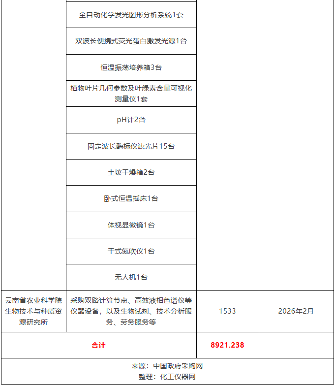 近期,云南省農(nóng)業(yè)科學(xué)院多家院屬單位發(fā)布2026年儀器設(shè)備采購意向,計(jì)劃采購全自動(dòng)智能固相萃取儀、自動(dòng)核酸提取儀、熒光顯微鏡、近紅外分析儀、組織細(xì)胞破碎儀、紫外分光光度計(jì)、高速冷凍離心機(jī)、真空冷凍干燥機(jī)等儀器設(shè)備,預(yù)算總金額8921.238萬元。預(yù)計(jì)采購時(shí)間2026年2月~11月。