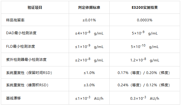 從數(shù)據(jù)可見,E3200 HPLC在各項關鍵指標上均優(yōu)于標準要求,尤其在最小檢測濃度、殘留率等核心性能上表現(xiàn)突出。