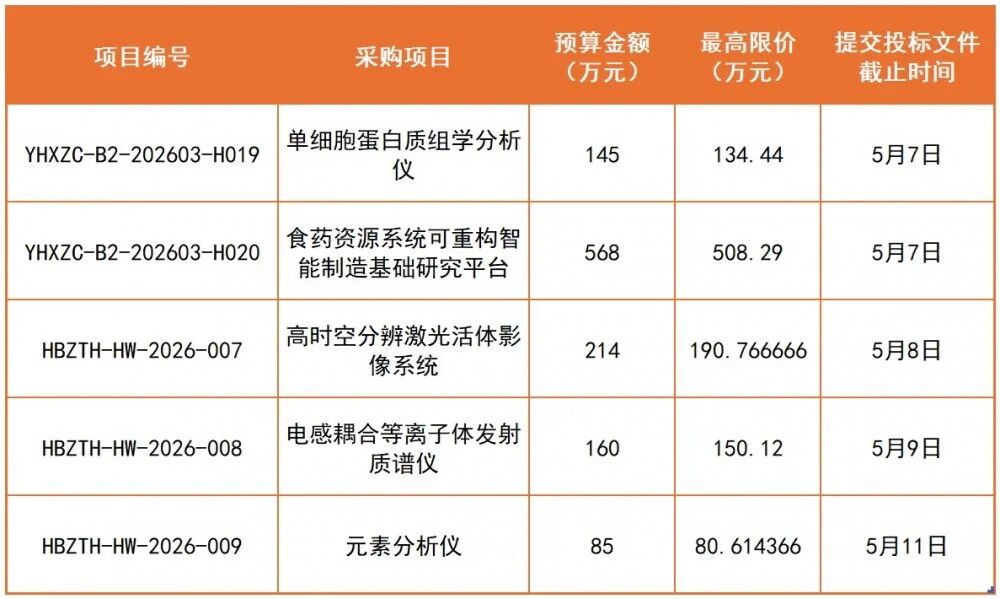 近日,武漢輕工大學(xué)生科院大型儀器設(shè)備平臺設(shè)備更新項(xiàng)目項(xiàng)目已正式啟動公開招標(biāo)。本次采購涵蓋單細(xì)胞蛋白質(zhì)組學(xué)分析儀、食藥資源系統(tǒng)可重構(gòu)智能制造基礎(chǔ)研究平臺、高時(shí)空分辨激光活體影像系統(tǒng)、電感耦合等離子體發(fā)射質(zhì)譜儀及元素分析儀等多套高端科研設(shè)備,整體預(yù)算金額達(dá)1172萬元,項(xiàng)目最早投標(biāo)截止時(shí)間為5月7日。