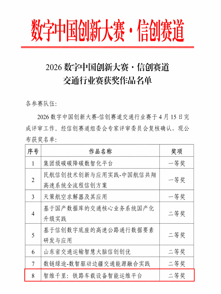 在行業(yè)創(chuàng)新與成果認定方面,"和行"軌道交通大模型同樣取得顯著突破:其創(chuàng)新應用作品《智維千里:鐵路車載設備智能運維平臺》在"2026年數(shù)字中國創(chuàng)新大賽信創(chuàng)賽道"交通行業(yè)賽中榮獲二等獎,充分展現(xiàn)了模型在實際場景中的創(chuàng)新價值與應用潛力;同時,該模型成果入選中國軟件行業(yè)協(xié)會《2025中國軟件產(chǎn)業(yè)發(fā)展藍皮書》成果征集,并獲評《2025年軟件和信息技術服務業(yè)先進性成果》1項;此外,"基于大模型的鐵路信號設備智能運維"創(chuàng)新應用案例成功入選中國鐵道學會《2025人工智能大模型驅動智能鐵路發(fā)展藍皮書》,成為智能鐵路大模型技術應用標桿案例,標志著"和行"軌道交通大模型在技術創(chuàng)新、產(chǎn)業(yè)應用與行業(yè)影響力方面獲得權威認可。